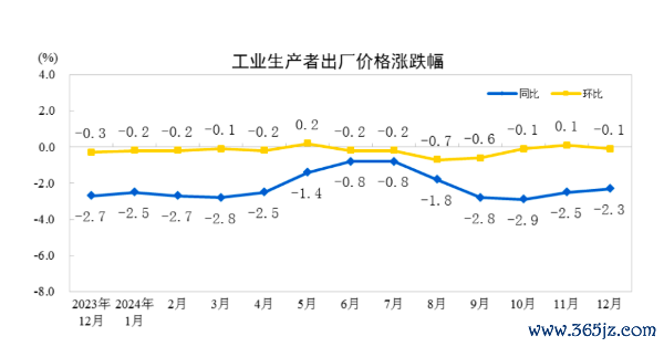 PPI方面,12月份,受部分行业进入传统生产淡季、国际大宗商品价格波动传导等因素影响,全国PPI环比下降0.1%,同比下降2.3%,同比降幅比上月收窄0.2个百分点。