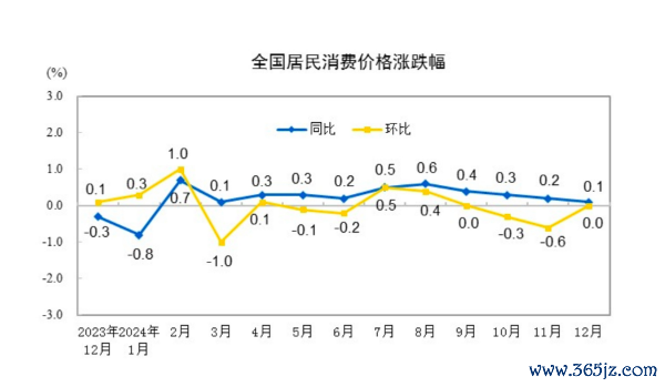 数据显示,12月CPI环比持平,同比上涨0.1%;PPI环比下降0.1%,同比下降2.3%。扣除食品和能源价格的核心CPI继续回升,同比上涨0.4%,涨幅比上月扩大0.1个百分点。